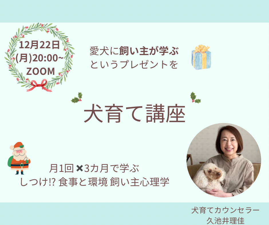 「犬育て講座」夜開催です❣️ 12月生募集開始 12月22日㈪20:00スタート 3カ月間学んで頂きます 2カ月目、3カ月目の日程は参加者の皆さんで話し合って進めていきます。 |
